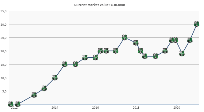 Nonetheless, maintaining the highest level of performance is a real challenge even for the best of the best, and Berardi inevitably experienced a dip in his playing form. In the following four seasons, the Italian failed to reach the ten-goal mark in Serie A, with his overall performance level plummeting quite a bit. However, Berardi returned to his best form last season as he contributed 14 goals and 10 assists to lead Sassuolo into the top ten finish. The Italian has maintained his good form into the 2020-21 season, which contributed to his transfer value rise.