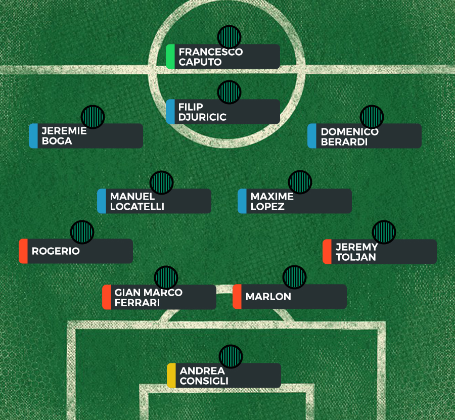 Expected Starting XI (4-3-1-2): Consigli; Toljan, Marlon, Ferrari, Rogerio; Lopez, Locatelli; Berardi, Boga, Djuricic; Caputo