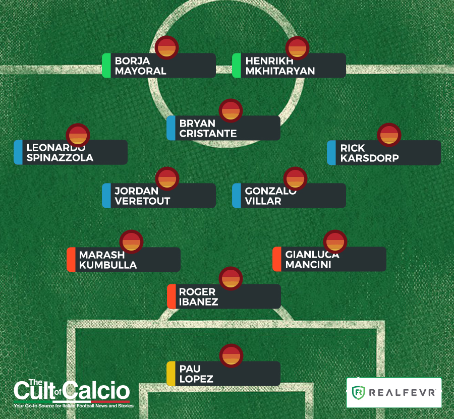 A few problems for Paulo Fonseca, who had to switch from his typical 3-4-1-2 lineup to a 3-5-2 outfit to cope with the absences of Edin Dzeko, Pedro, and Lorenzo Pellegrini. The strikers will thus be Borja Mayoral and Henkrikh Mkhitaryan.