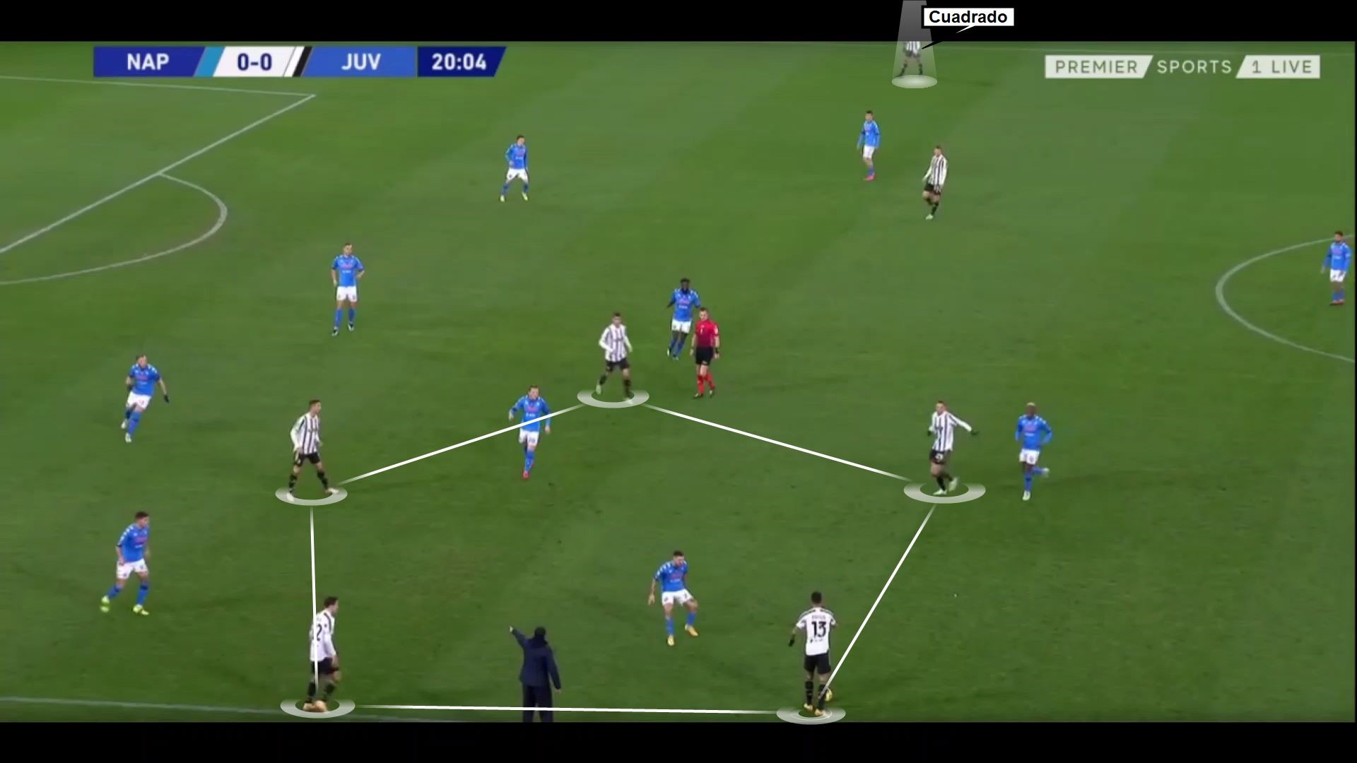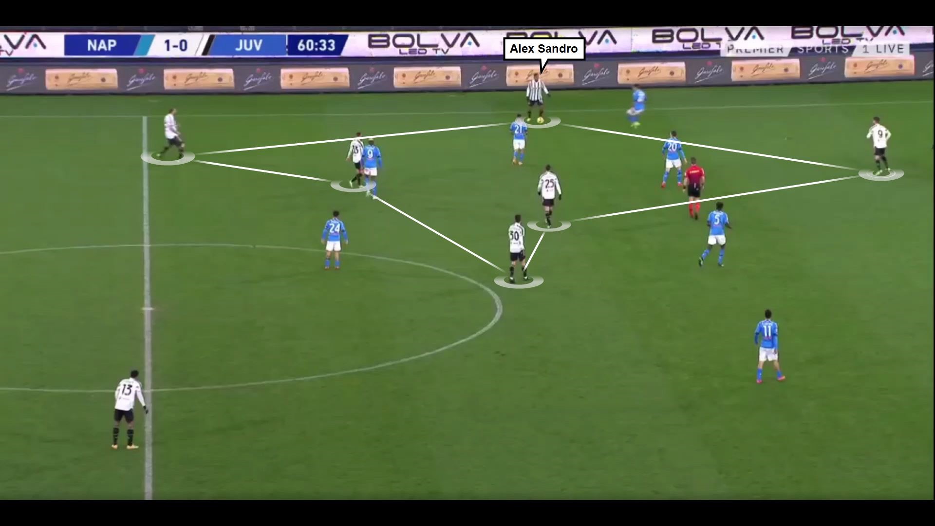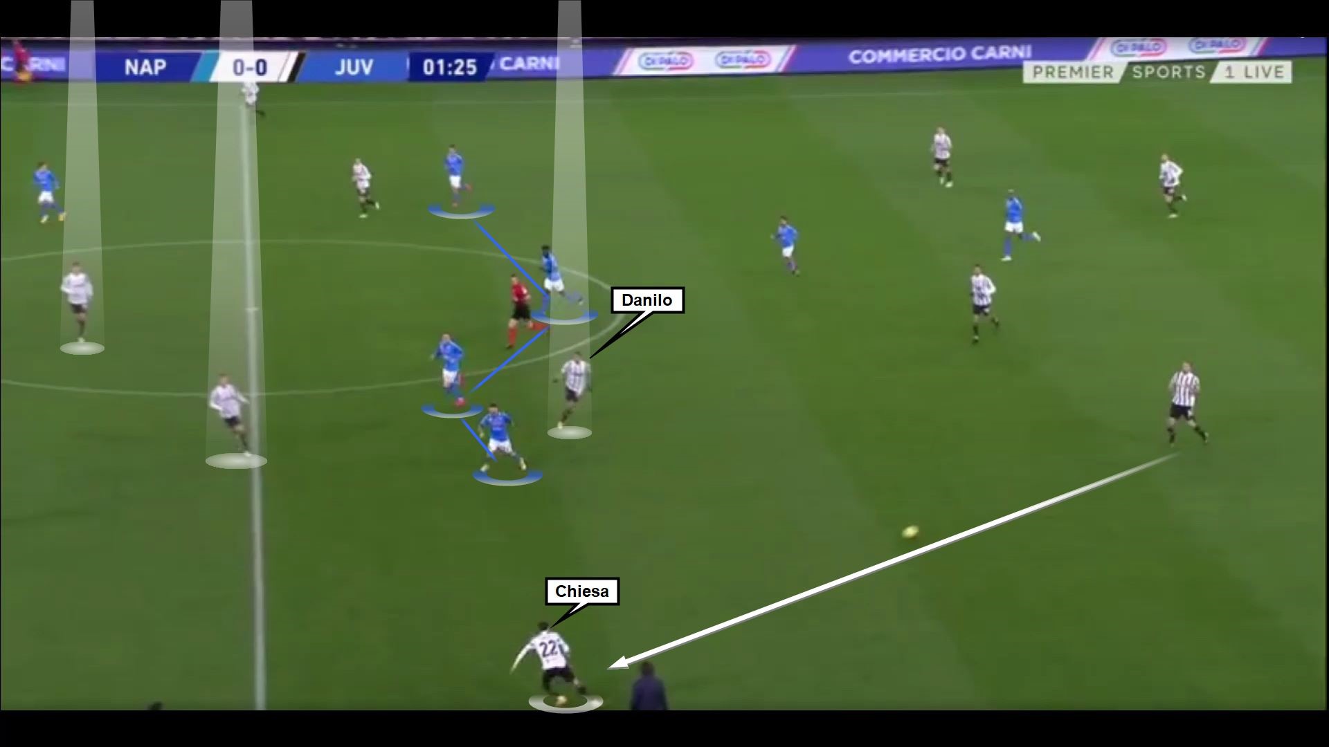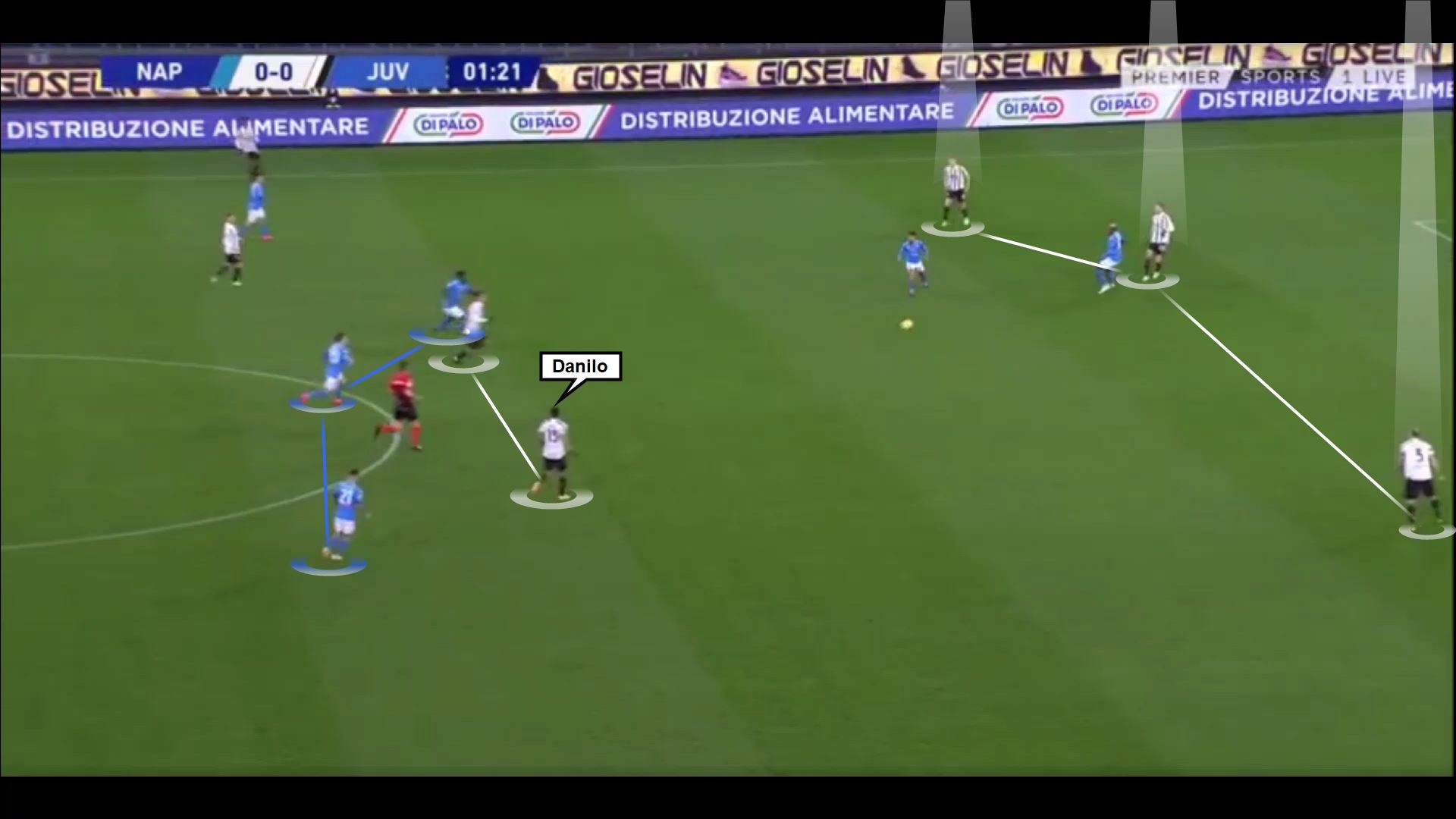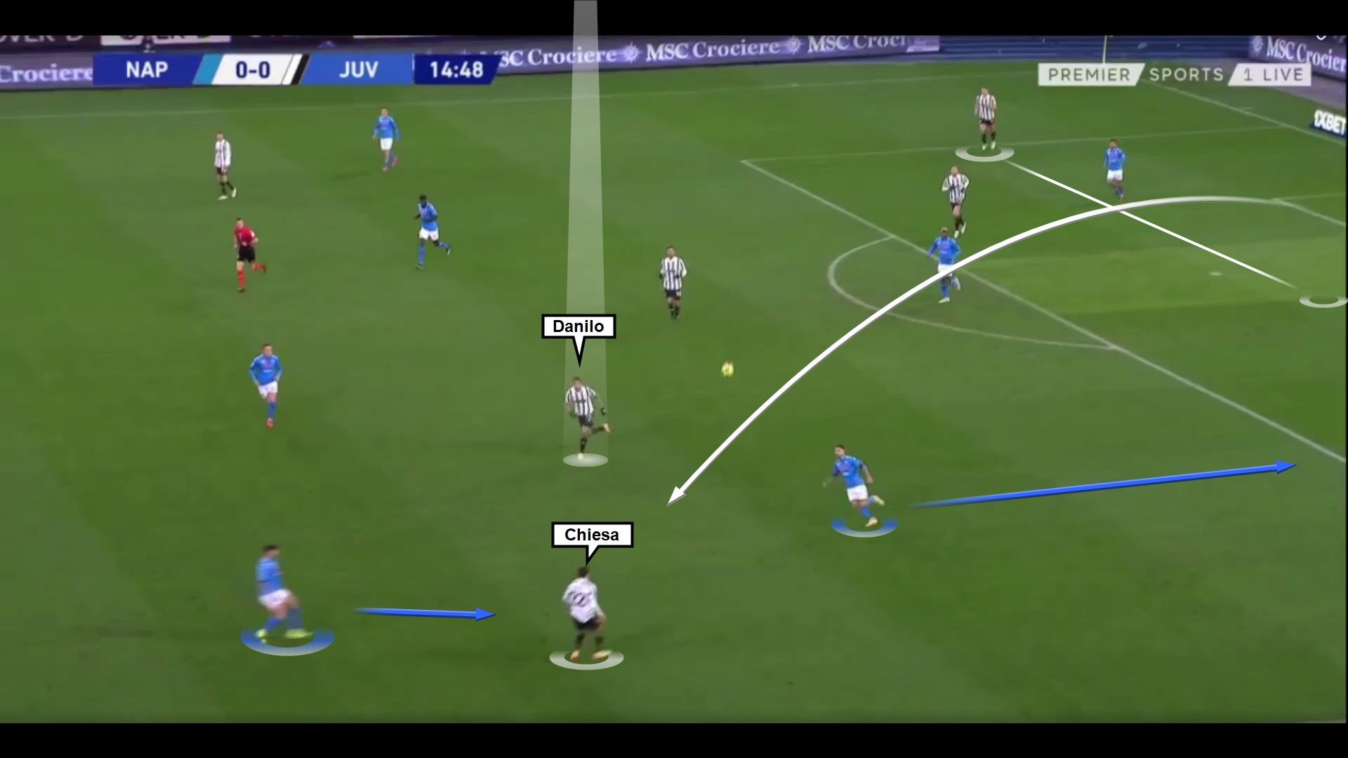 In the images below, we start with Juventus’ build-up play when Napoli were attempting to press their opponents higher up the pitch. In the first half, the often reoccurring pattern was to see Danilo occupying a central midfield spot in order to fill in the absence of one of the central midfielders who dropped in between the center-backs to facilitate the build-up. Additionally, such a manoeuver opened the wide areas, particularly the left flank, where Chiesa was playing in the first half.