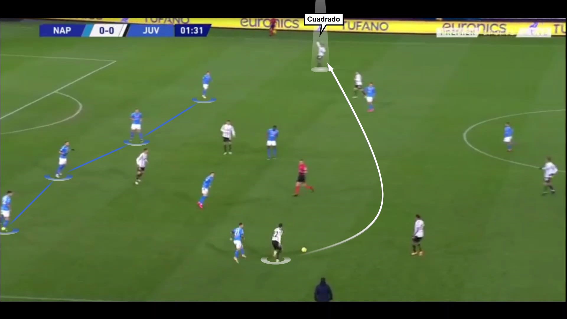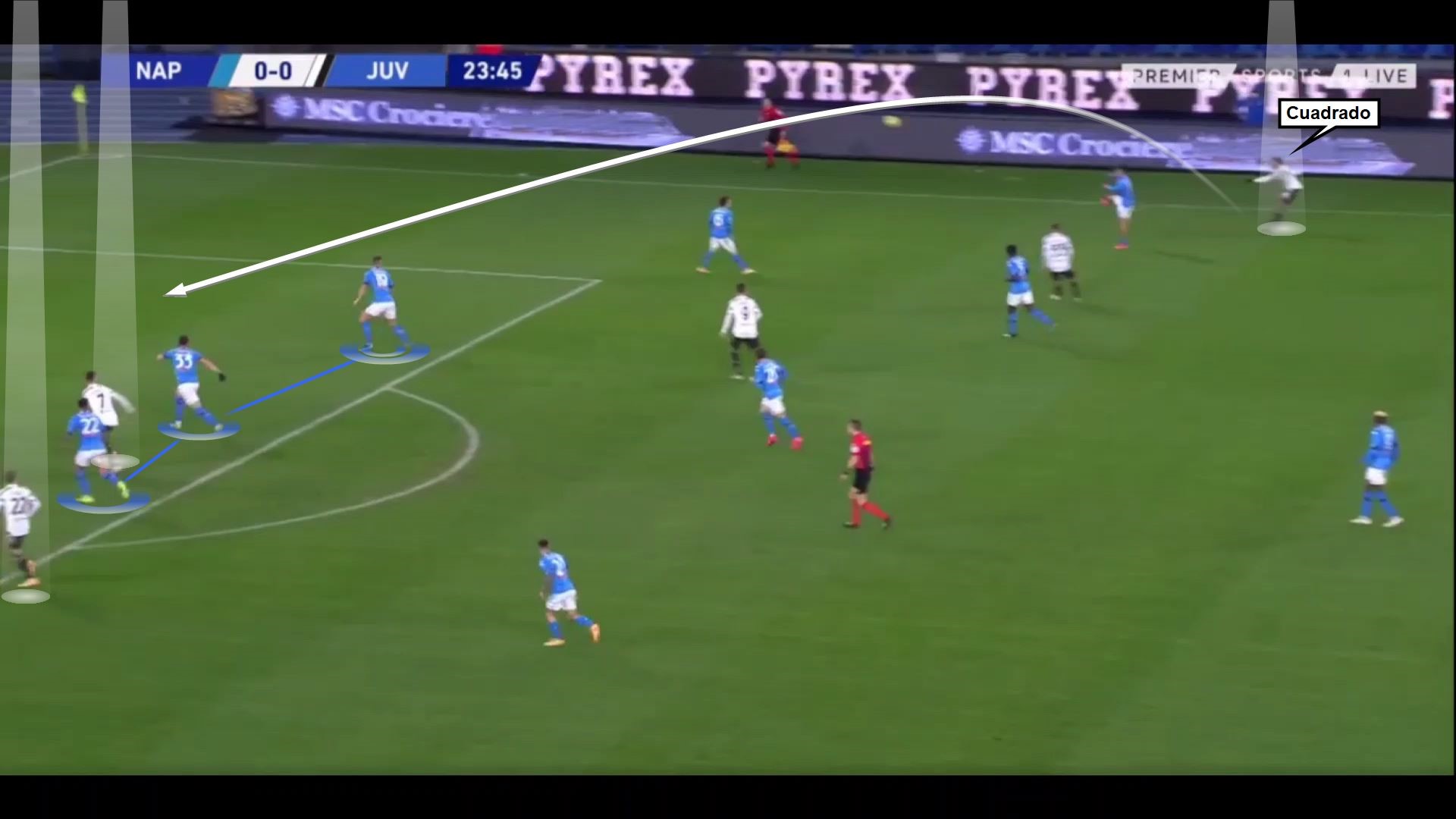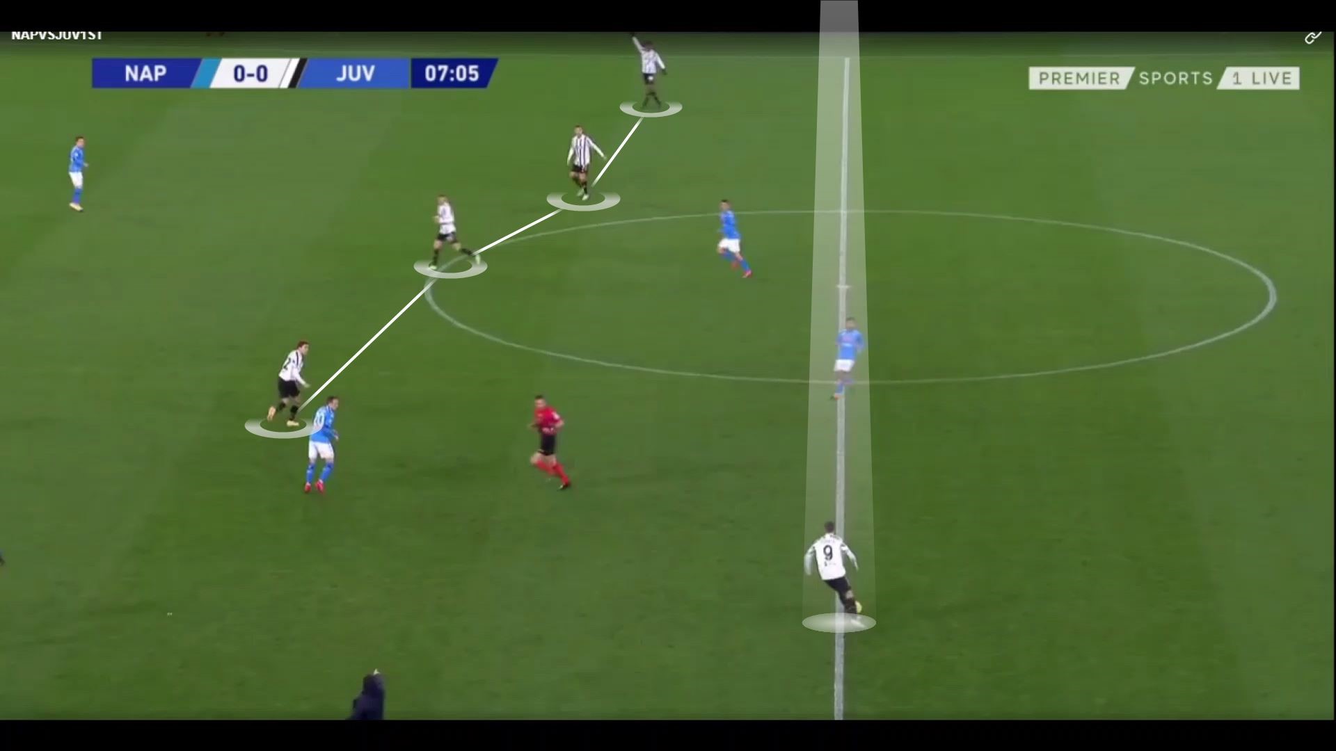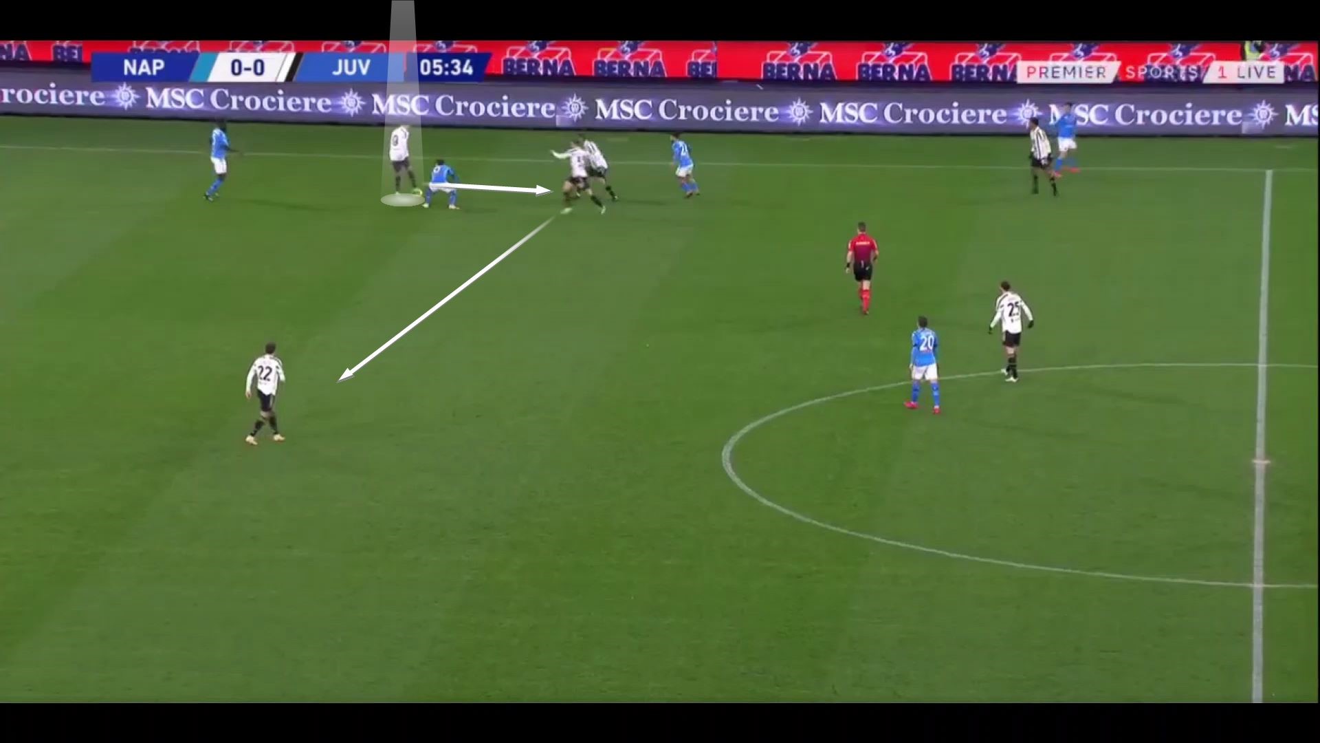 In this case, Juve were successful in bypassing Napoli’s high press on the overloaded left side, which created space on the opposite wing for Cuadrado to exploit. Unfortunately, Morata’s crossfield pass was poor and did not reach the intended target.
