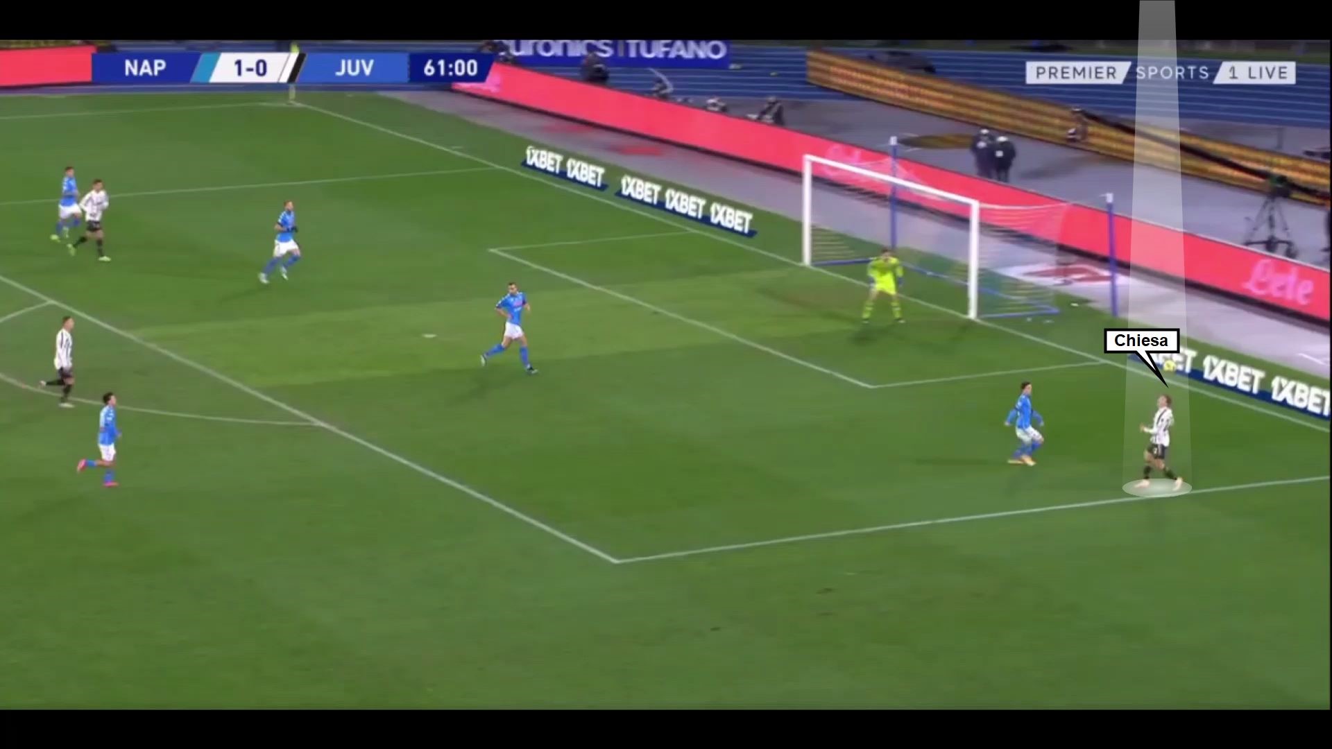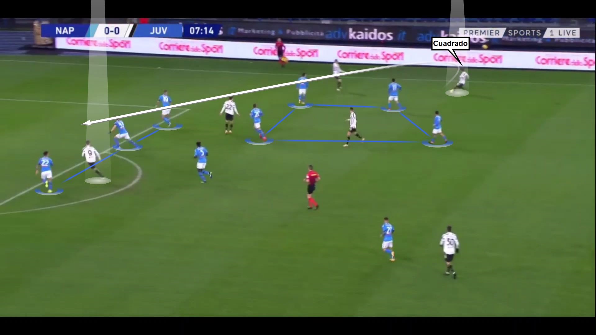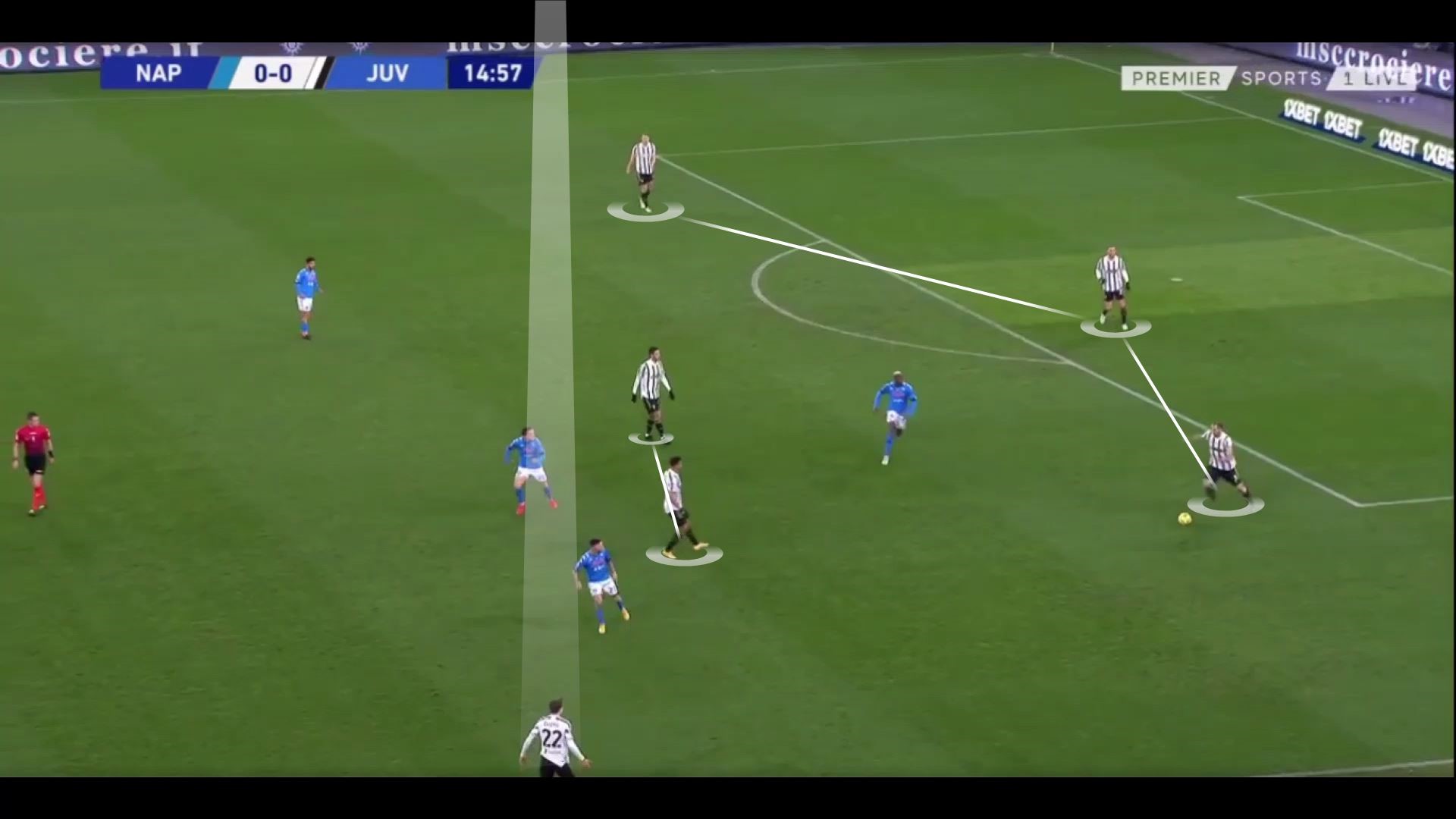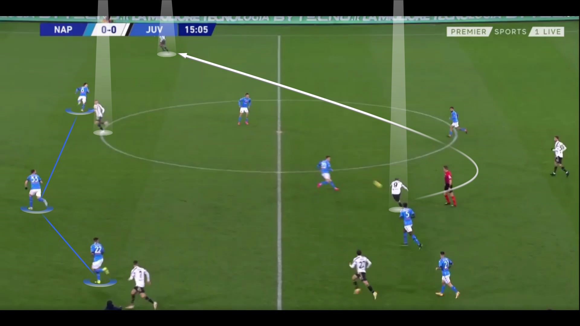 In this case, Juve were successful in bypassing Napoli’s high press on the overloaded left side, which created space on the opposite wing for Cuadrado to exploit. Unfortunately, Morata’s crossfield pass was poor and did not reach the intended target.