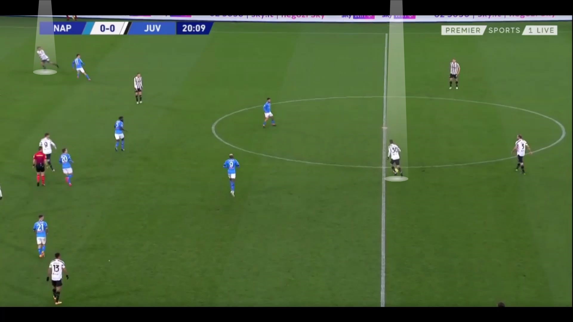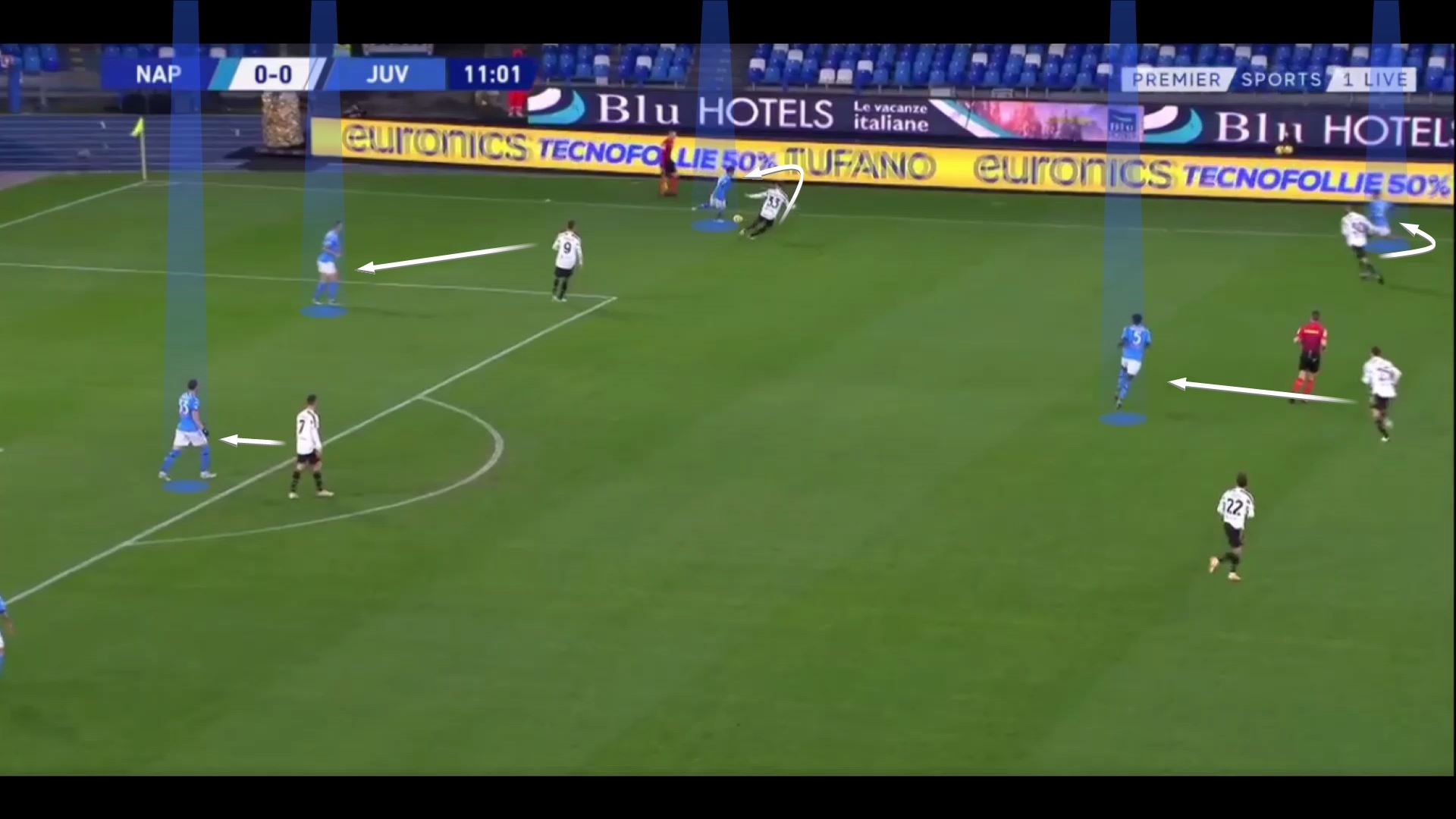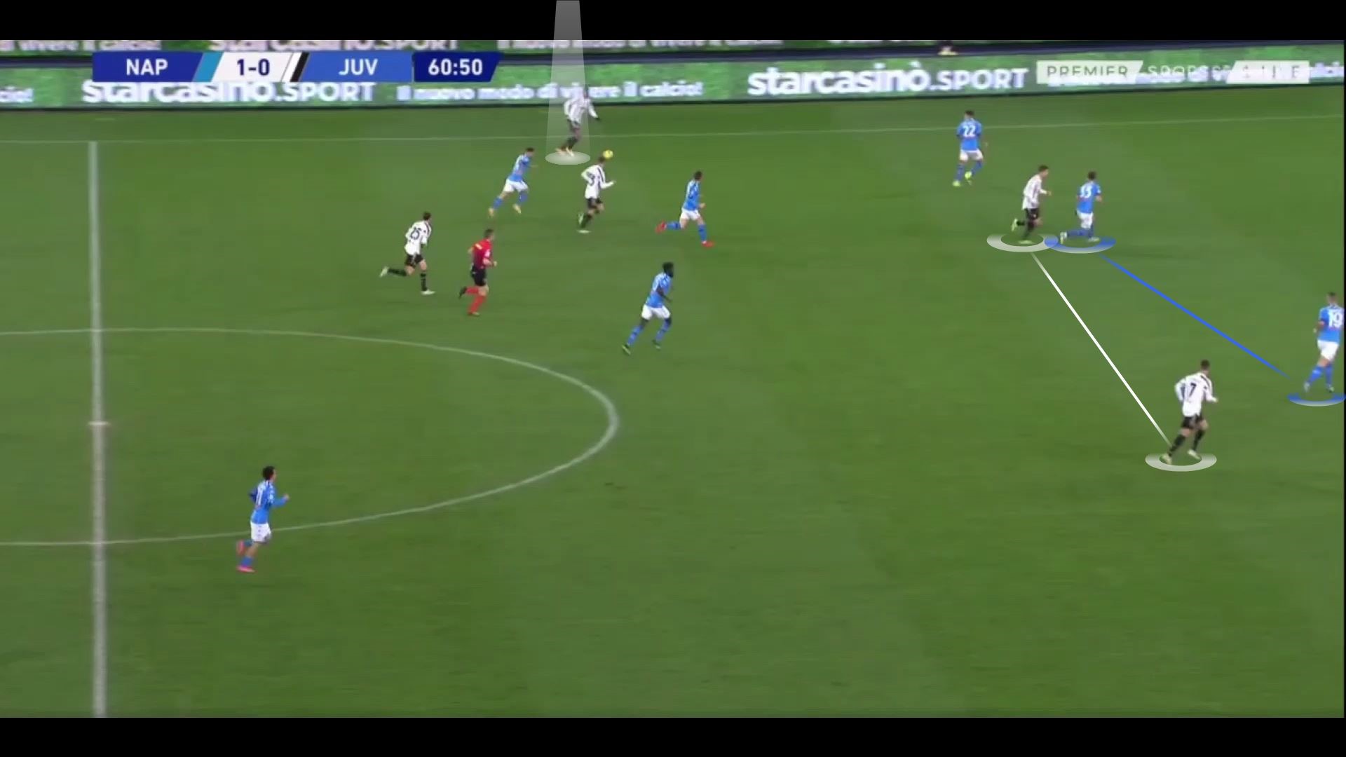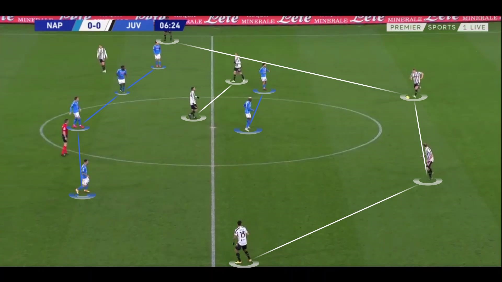 Consequently, if Juve managed to break out of Napoli’s press successfully, they would have someone receiving the ball on the underloaded side, like in the example presented below. However, in most instances, the ball receiver was too slow to take advantage of the situation and switch the play to the side overloaded with Juventus players.