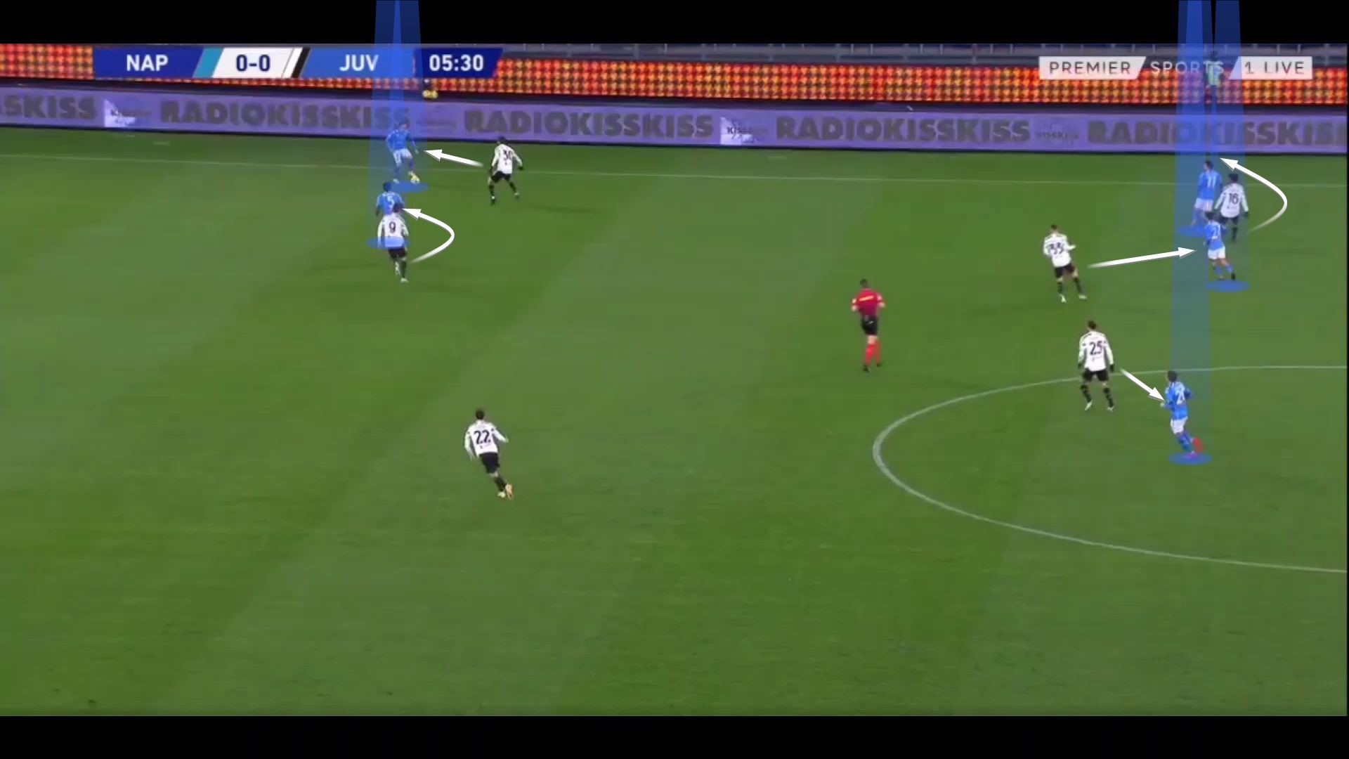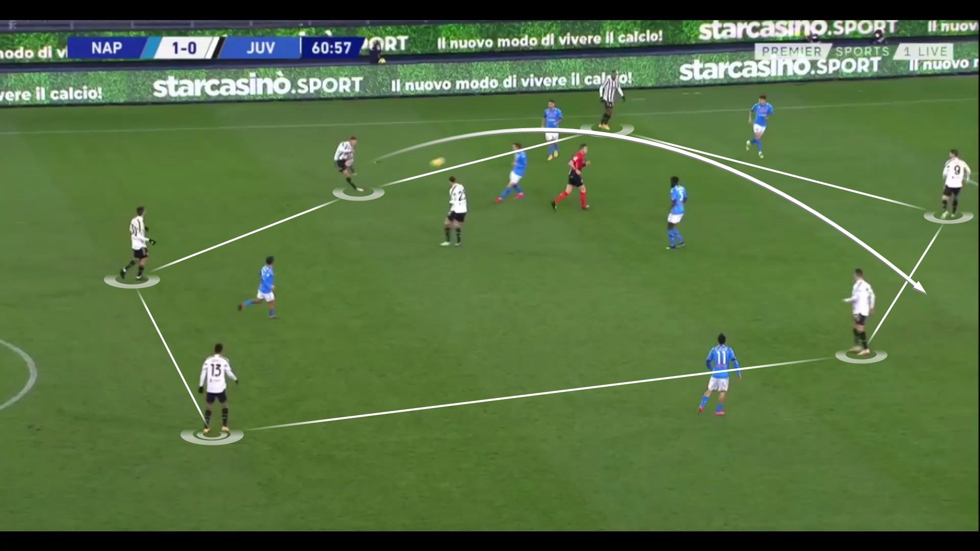 Nevertheless, Juve stuck to their principle even when Napoli retrieved to a low-mid block. As we can see in the illustrations below, the Bianconeri have five players on the ball side, thus dragging Napoli players out there as well. The intention was to switch the play from left to right once again, but a player on the ball – Bentancur in this instance – did not attempt to play a diagonal pass for some reason.