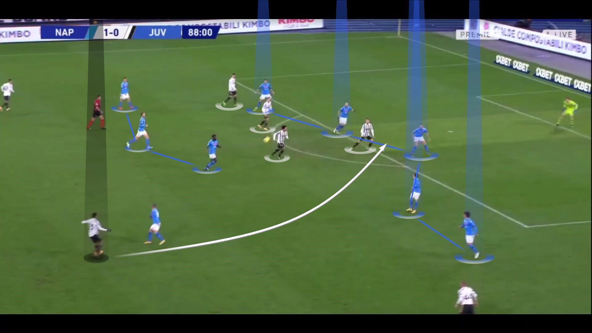 Against Napoli, Juventus recorded even higher numbers for all the aforementioned metrics, including progressive passes (49), passes into the final third (39), and crossfield passes (18). The reasons for that are twofold: First, on occasions, when Napoli were applying a high-press, Juve had to play out from the back from deep areas, thus increasing the length of the pitch that allowed a more vertical ball progression and more switch of play in their build-up. Second, when Napoli retrieved into a low defensive block, it was much easier for Juventus to reach the final third of the pitch.