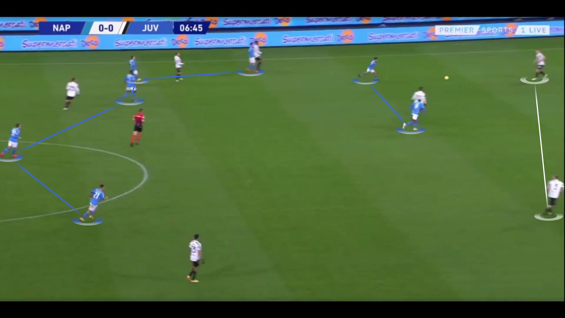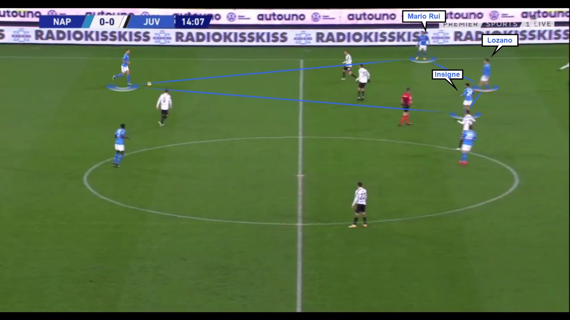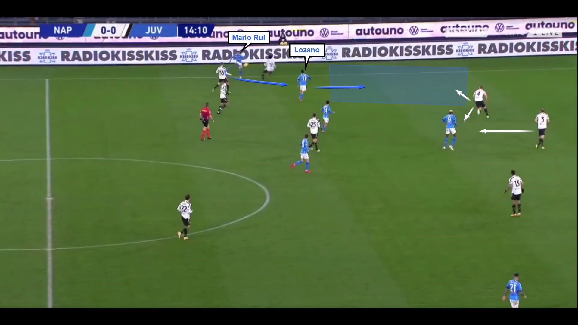 The most logical explanation for this is that Napoli simply decided to shut up shop after going 1-0 ahead, despite being relatively unimpressive from the attacking sense prior to their goal as well. Nevertheless, when Napoli did go forward, they tended to build their play down the left side of the pitch, with Mario Rui, Lozano and Insigne all combining in tight spaces. The principle of overload and underload was also present in Napoli’s game as can be seen in the images below. It is worth noting that the build-up play that led to free-kick and eventually the penalty also took place down the left side.