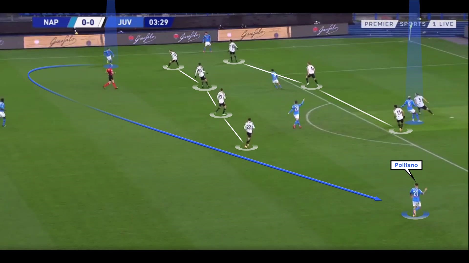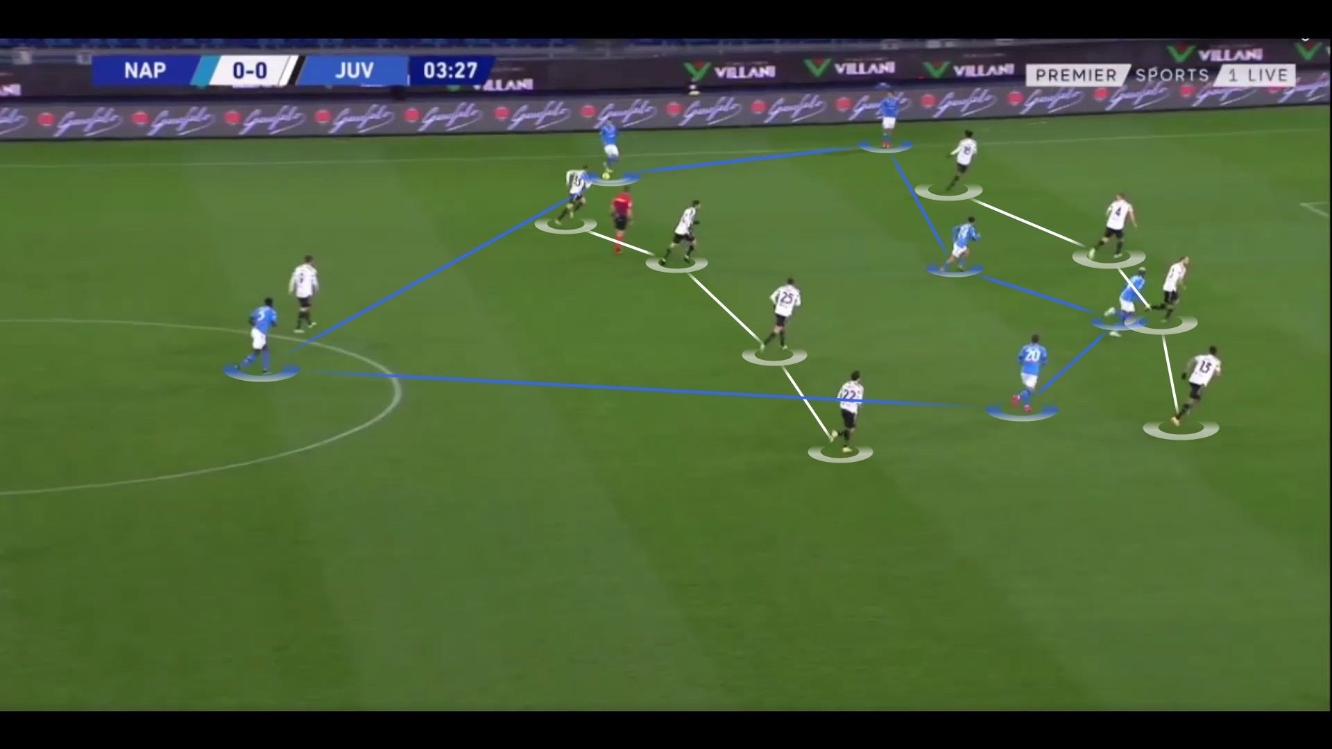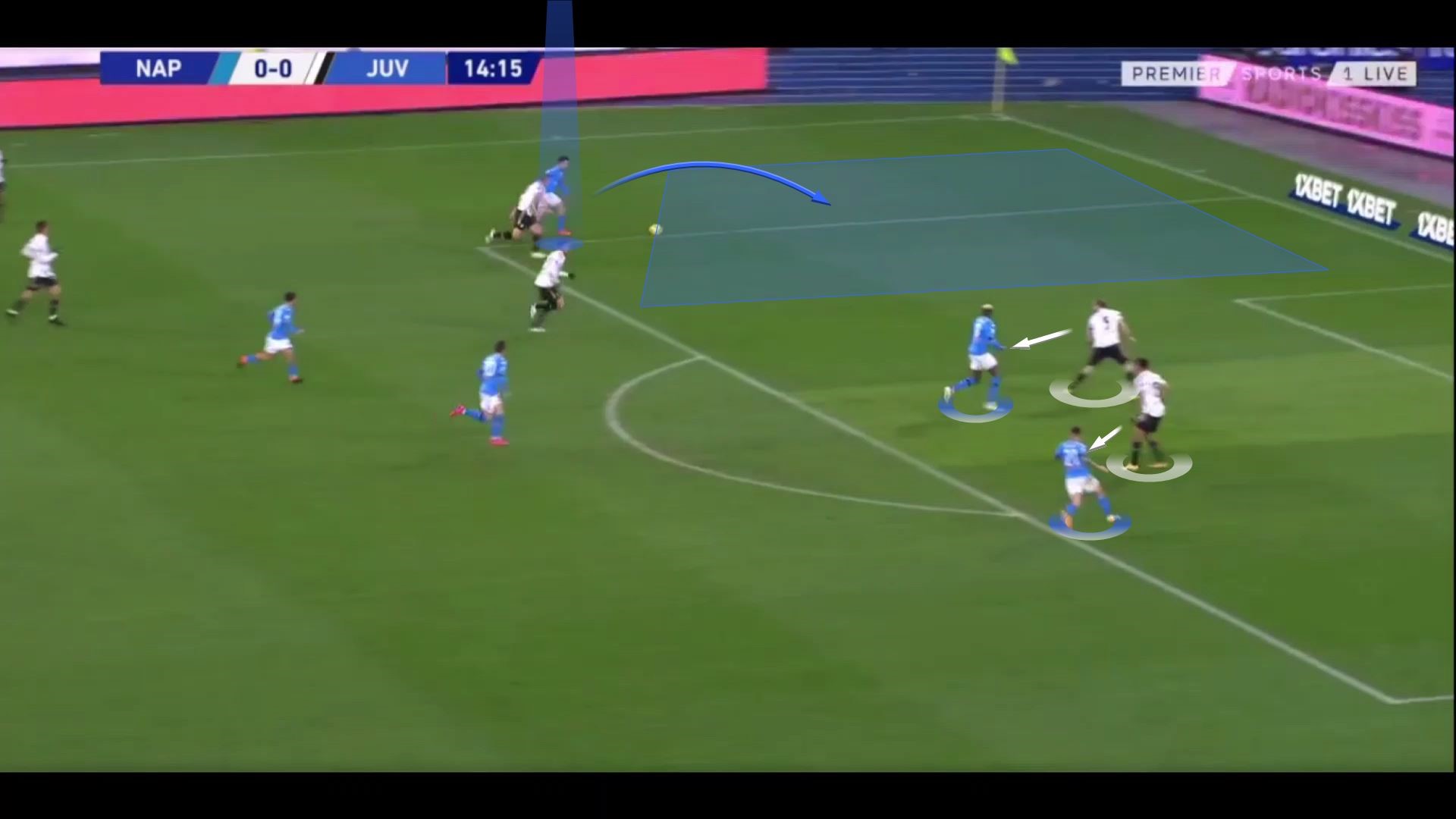 The most logical explanation for this is that Napoli simply decided to shut up shop after going 1-0 ahead, despite being relatively unimpressive from the attacking sense prior to their goal as well. Nevertheless, when Napoli did go forward, they tended to build their play down the left side of the pitch, with Mario Rui, Lozano and Insigne all combining in tight spaces. The principle of overload and underload was also present in Napoli’s game as can be seen in the images below. It is worth noting that the build-up play that led to free-kick and eventually the penalty also took place down the left side.